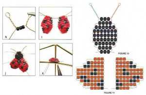 Начинайте плести насекомое с головы, а потом переходите на туловище, чередуя цвета бисерин равномерно. Если бисер используется светлый, то божья коровка будет смотреться ярко и броско. Затем согласно схемы плетите два крылышка для нашей фигурки. Когда и они будут готовы, их устанавливают на туловище, а потом крепят подвеску к зажиму. В работе можно использовать проволочку разного цвета.