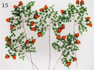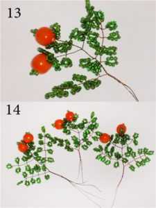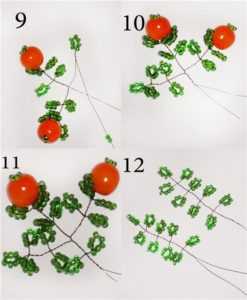 Далее необходимо сплести две веточки из зеленых стекляшек, на которых должны быть петли по девять штук. Готовые заготовки следует прикрутить к ветке с апельсинами. У вас должна получиться тройная ветвь. Общее число заготовок, из которых будет состоять дерево, должно быть три штучки.