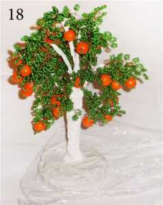 Для изготовления этого варианта, используется французская техника плетения. На нескольких отрезках проволоки плетут листочки, которые потом объединяют друг с другом в ветки с оранжевыми плодами апельсина из бисера. Чтобы крона получилась пышной и красивой, вам необходимо создать, как можно больше веточек.