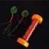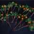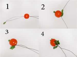 Апельсиновое дерево начинают плести с веток. Возьмите тонкий отрез длиной 80 см. Наберите на него одну оранжевую бусину крупного размера. Затем продвиньте ее на серединку основного материала. Протяните один конец проволоки в эту бусину. Далее на длинный конец нужно нанизать 7 бисерин изумрудного оттенка и сделать петлю, скрутив края друг с другом. Потом снова наберите 7 аналогичных бисерин и выполните плетение еще такой же петлицы. Вам нужно сплести три таких завитка. На представленном фото показан весь процесс.