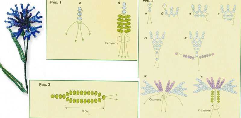 Для плетения листика понадобится отрез протяженностью тридцать сантиметров и изумрудный бисер. Наберите 1 элемент по центру и 3 на два конца. Потом на каждый кончик нанизывают еще по три сантиметра бисера, а в конце закрепляют элементом сразу на две стороны, как показано на рисунке № 3. Остается присоединить василек к стебельку и скрутить проволочку на 3 см. Второй листок плетут аналогично и также крепят к стеблю. Теперь полевой цветочек полностью готов.