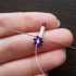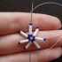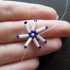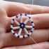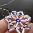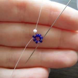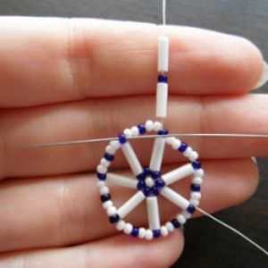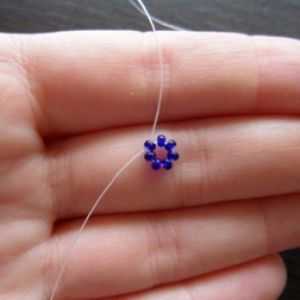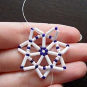 Затем тяните основной материал через ближний стеклярус и голубую бусинку. Нанизывайте круглый элемент и следите за тем, чтобы стекляшка находящаяся по центру оставалась синего цвета. Число стекляшек должно быть в количестве пяти штук. Далее тяните проволочку сквозь верхнюю бисерину соседнего лучика. Повторите такие аналогичные действия еще 6 раз так, чтобы образовалось внешнее колечко на будущей звездочке.