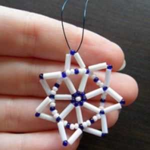 Проволочку нужно закрепить с помощью узелка и протащить сквозь парочку бусин. Таким образом вы спрячете совершенно не нужный элемент. Вот и все, звезда из бисера полностью готова и ее можно теперь применить где угодно. Возьмите леску и пропустите ее через округлую стекляшку, которая находится в одном из внешних лучиков звезды, а потом следует завязать края лески. Такая звездочка может стать оригинальным кулоном на шею или сережками, а быть может вы захотите ею что-нибудь украсить, например новогоднюю елку.