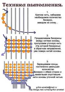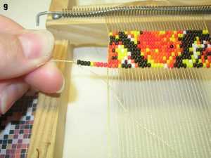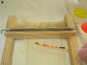 Бисероплетение начинается с изготовления основной части аксессуара. Свяжите узелком тканную нитку с первой ниточкой, находящейся с левой стороны. Пропустите первую под всеми расположенными вертикально слева направо. Далее нужно набрать бисерины в необходимом количестве для одной полосы и указательным пальчиком выдавить стекляшки между основными нитками, как показано на фото. Затем пропустите иголку в обратную сторону справа налево, по верхушке станка. Все остальные полоски плетите по аналогии, располагая их максимально плотно друг к другу, и натягивая основной материал.