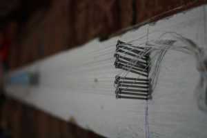Еще один вариант плетения по схеме, будет выполняться практически аналогично. Если у вас нет специального станка, тогда сконструируйте его своими руками самостоятельно. Возьмите деревянный брус и забейте по двум его сторонам небольшие гвозди, расположив их друг возле друга, практически впритык, как показано на фото.