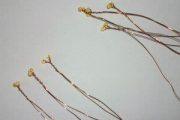 Для изготовления тычинок берем проволочку и набираем на нее бисер желтого цвета. Отделяем три бисеринки и производим скрутку проволочки в дину около двух сантиметров. Таким образом получается ножка. И так далее продолжаем нанизывать по три бисерины и делать скрутку. Чем пышнее у вас получится такая заготовка из тычинок, тем лучше.