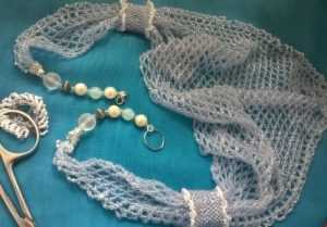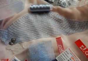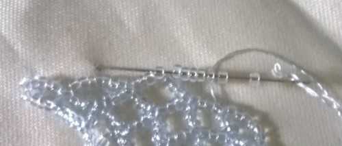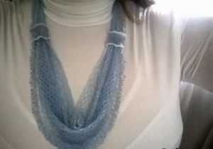 Для плетения такого аксессуара вам понадобится бисер нежно-голубого цвета, немного белого и серебристого. Нанизывание стекляшек будет происходить с помощью иголки и простой нити. Ведь именно шелковая нить даст эффект нежного и струящегося полотна. Если вы решите использовать мононитку, то она сделает изделие плотным и тугим. И украшение будет на вашей шее просто неподвижно лежать. Вденьте нитку в два слоя и завяжите узелок. Старайтесь подстроить свое бисероплетение так, чтобы нить заканчивалась по возможности в конце ряда. Тогда вы сможете ее присоединить новым узелком или приклеить клеем ПВА. В конце вам потребуется еще и леска, которой следует пройти весь периметр изделия для большей прочности.