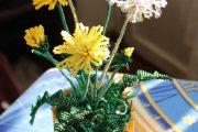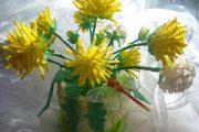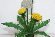 Теперь соберите все составляющие в одну композицию и обмотайте стебли флористической лентой зеленого цвета. Сделайте одуванчику подставку из гипса или «посадите» его в горшочек. Оформите подставку, используя ткань, бисер или природный материал и изогните растение по вашему усмотрению. Вот и все. Наш флористический шедевр готов.