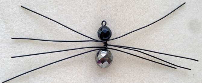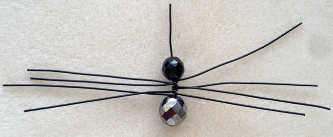 Отрезаем четыре штучки проволочки протяженностью двенадцать сантиметров каждая. Выполните виток так, как показано на фото. Для крепления лапок, введите в работу бусины. Меньшего размера используют для головы, а большего для тела паука.