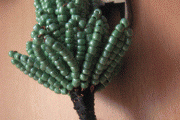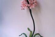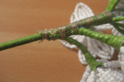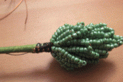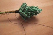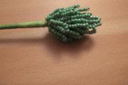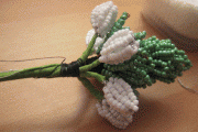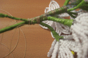 Переходим к этапу формирования птицемлечника из бисера. Для этого, готовим прочный отрезок проволочки, который необходимо обмотать цветочной лентой зеленого цвета. Далее, необходимо прикрепить первую, сделанную нами заготовку из петелек около стебля. Кончики проволочки при этом можно прикрыть вновь используя цветочную ленту. Вслед за верхушкой, начинаем присоединять листья в несколько ярусов. Первый ярус состоит из пяти листочков, второй – шести и третий – семи. Для того, чтобы скрепить такую конструкцию, можно по ходу присоединения листьев обматывать основание нитями и закреплять лаком, после этого уже закрывать все цветочной лентой. После листьев присоединяем бутоны, за ними – полураскрывшиеся бутоны и последним ярусом идут цветочки. Присоединяйте такие заготовки на некотором расстоянии друг от друга. Помните, что по форме птицемлечник должен напоминать конус.