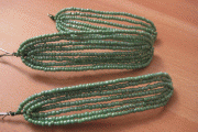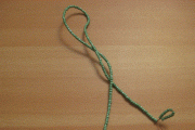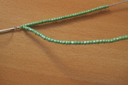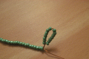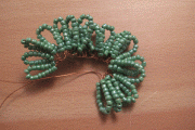 Мастер-класс начинается с плетения верхней чати птицемлечника из бисера. Для этого на проволочку необходимо набрать зеленые бисеринки, протяженностью семьдесят пять сантиметров. Далее, на расстоянии десяти сантиметров от кончика провололки формируем петли. Каждая такая петелька состоит из приблизительно из трех сантиметров зеленых бисеринок. Сделав одну петельку, необходимо под ней скрутить проволочку на три оборота и, таким же образом ,продолжить изготовление следующих. Всего плетем двадцать пять петель, как на фото.