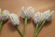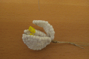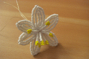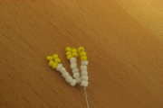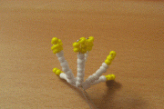 Начинаем плести цветочки подобных методом, как и бутоны. Сначала, набираем на проволочку бисеринки белого цвета. Далее на подготовленную ось нанизываем белые бисеринки, протяженностью 1,5 сантиметров и совершаем два полноценных витка около оси. Для изготовления одного цветка, необходимо сплести шесть лепесточков. Всего нам нужно сделать пять цветков для птицемлесчника из бисера. Тычинки формируем набором на проволочку такой последовательности бисеринок: семь бисерин белого цвета и пять – желтого. Теперь продеваем кончик проволочки сквозь бисеринки белого цвета. Всего создаем шесть тычинок. Далее приступаем к сборке цветка. Делаем этот процесс по аналогии с предыдущим.