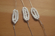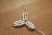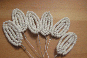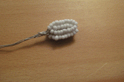 Также для птицемлечника нам нужно изготовить бутоны, которые только начинают распускаться. Для этого набираем на проволочку бисеринки белого цвета. Далее формируем ось и нанизываем на нее один сантиметр бисерин белого цвета и совершаем уже пару полноценных витков около оси. Один такой бутончик, будет также состоять из трех лепесточков. Итого плетем пятнадцать заготовок.