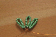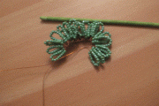 На следующем этапе, мастер-класс переходит к изготовлению листьев. Для этого используем технику французского плетения. На ось нанизываем бисеринки зеленого цвета протяженностью в один сантиметр. Далее, необходимо совершить один полноценный виток около оси. Осталось скрутитть проволочки друг и другом под основанием лепестка. Всего, таки способом делаем восемнадцать листьев из зеленого бисера.
