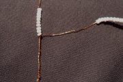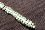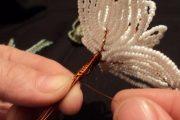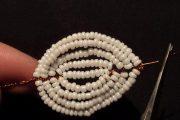 Продолжаем параллельное плетение добавляя в серединку нашего листочка одну бисеринку белого цвета. То есть, начиная с третьего ряда нанизываем на проволоку такую последовательность бисерин: одна зеленая, одна белая и одна зеленая бисерина. Каждый ряд формируем, проводя кончики проволочек сквозь три набранные бисеринки по направлению одна к другой. Варьируйте число рядов в листья от двадцати пяти до тридцати пяти.