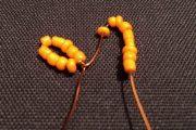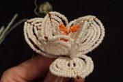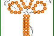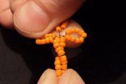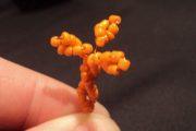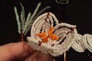 Для этого, готовим отрезок проволоки в пятнадцать сантиметров и набираем девять бисеринок оранжевого цвета. Теперь необходимо отступить от кончика проволоки на расстояние пяти сантиметров и сформировать бисерную петлю, скрутив отрезок проволоки между собой. Таким образом продолжаем далее создавать петельки в количестве трех штук. После этого, на оба кончика проволочки набираем около одиннадцати бисерин и перекручиваем проволочку по набранным бисером. Далее , перекручиваем набранные бисеринки по кругу и получаем готовую сердцевинку для крокусов из бисера, как на фото: