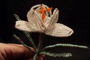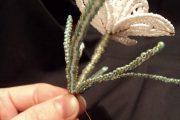 Созданную заготовку цветка крепим к толстому проволочному стержню, который впоследствии необходимо обмотать нитями зеленого цвета. По ходу обмотки стебля крепим вокруг него бисерные листья.
