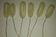 Чашелистик для пиона изготавливаем так же, как тычинки. Делаем 5 петель, состоящих из 30 бисеринок. На этом мы заканчиваем бисероплетение пиона и приступаем к его сборке.