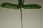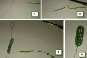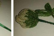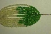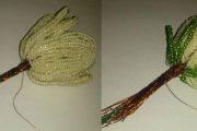 На отрезке проволоки длиной 50 см делаем петлю и набираем 10 зеленых бисерин. Затем продолжаем набирать бисерины уже основного оттенка. Делаем дугу и повторяем. Нужно сделать 11 таких дуг. Затем плетем еще 3 лепесточка для бутона.