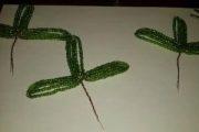 Нужно сделать 9 листиков по 7 дуг. Размер их должен быть как у маленьких лепестков пиона. Готовые листики пиона соединяем в веточки по три штучки.