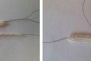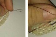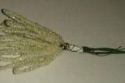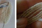 Для изготовления пиона мы будет использовать французскую технику плетения дугами. Для лепестка наберем бисеринки выбранного оттенка так, чтобы длина этого отрезка была около 1 м. Далее, необходимо скрутить петлю и на оставшийся свободным конец длиной примерно 10 см, наберем бисеринки в количестве 20 шт.
