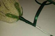 Тоже самое делаем и с основным цветком, обматывая стебель скотчем и лентой, по ходу дела крепим бутон и листочки. Чтобы лучше понять, как формируется пион, можно посмотреть соответствующее видео.