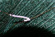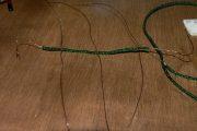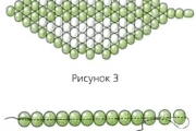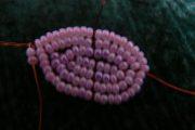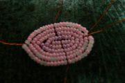 Берем кусок проволоки, взятый за центральную ось, нанизываем на него необходимое количество бисера, соответствующее определенной нами длине. Перпендикулярно оси у нас будут располагаться 3 дополнительных проволоки, условно обозначающие верх, середину и нижнюю часть и обеспечивающие надежную прошивку листочка в трех местах. Затем плетем, таким образом, 4 дуги, формируя круглый верх и заостряя нижнюю его часть. Завершив этот этап, отмеряем 60 см проволоки и отрезаем ее от катушки.