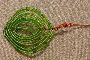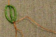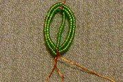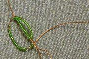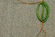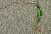На ось нанизываем 17 зеленых бусин. На конец проволоки – одеваете 20 шт. и моделируете 1-ую дугу, оборачивая проволоку вокруг оси. Там же одеваете еще столько же бисера (20 шт.) и скручиваем 2-ю дугу.