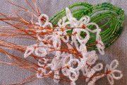 В этом МК цветочек сделан из 4-х лепесточков. Когда сплетете все тридцать цветочков – их необходимо складывать пучками по 5 шт. Таким образом вам будет легче складывать веточку (см. схемы).