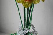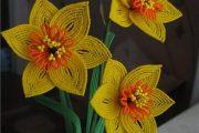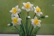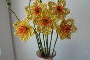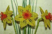В настоящем уроке мы расскажем вам о прекрасном рукоделии, или даже искусстве, название которого звучит как бисероплетение. Если быть более точными, то сейчас речь пойдет о том, как плести нарциссы из бисера. Эти цветы особенно любимы в народе, потому что они появляются весной в наших домах одними из первых наравне с подснежниками и мимозой. Поэтому их считают символом пробуждения жизни после зимних холодов. Живые нарциссы имеют великолепный внешний вид, который нам нужно максимально близко воспроизвести в бисере. Вы можете, конечно, повесить в вашем доме огромное фото этих цветов, которое без сомнения украсит интерьер. Но все же плетение бисером будет иметь совершенно другой эффект. Наш мастер класс, к которому прилагается видео, поможет вам разобраться в технике работы при изготовлении нарцисса из бисера. В нем мы расскажем вам, как правильно трактуется схема плетения нарцисса.