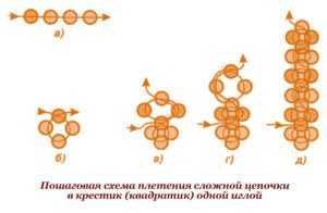 Возьмите отрезок проволочки и наберите на него четыре штучки бисера. Потом один конец протягивайте сквозь первые 3 элемента, сформировав бисерный круг. В таком случае вы не только сможете задержать цветные элементы на проволочке, но и сформируете первый крест, о котором было написано ранее. Далее наберите на иглу еще дополнительно 3 бусинки, и введите ее в 4-ую бисеринку последнего р. В итоге у вас образуется следующий крест.