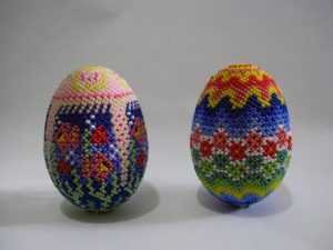 В вариантах для опытных рукодельниц предусмотрены более сложные мотивы, состоящие из десяти и больше цветов, а также имеющие мотивы с разными узорами и орнаментами. Например, вы можете сделать своими руками такое красивое оплетение пасхального яичка, как показано на фото или оформить другой объемный предмет интерьера, которым можно украсить праздничный стол и не только.
