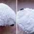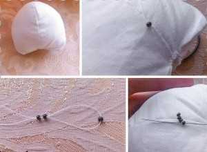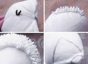 Постепенно двигаемся вверх, выполняя это движение по спирали. В процессе этого движения пришьем крупные белые бусинки для глаз. Верхняя часть головы будет украшена бисерным мехом, но не через ряд, а в каждом ряду. На макушке мех должен быть более густым, чем на туловище. Когда процесс вышивки бисером завершен, сшейте вместе голову и тело овцы. Детали необходимо сделать очень плотно прилегающими друг к другу. Вы сможете достичь этого, если пройдете иголкой и ниткой не сквозь бусины, а через ткань.