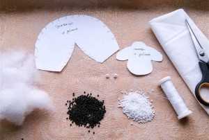 Обе части выкройки головы соединим, сшивая контур, и оставив на верху головы овцы немного места для наполнения. Самым удобным местом для этого является макушка, потому что шов можно сделать невидимым под мехом из бисера. И вот мы соединили при помощи ниток все детали овцы, провели наполнение мягким материалом, а теперь должны сделать бисерный мех. Для этого нашейте своими руками бусины на определенные участки фигурки. При помощи карандаша выделите ноги и копыта овечки. Затем продолжаем наш мастер класс, и начнем расшивать бисером разные части тела овцы.