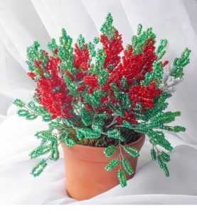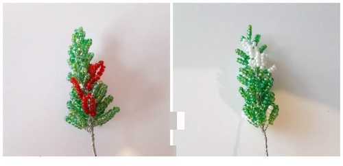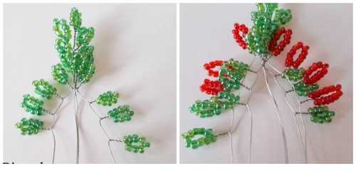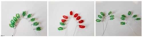 Дальше будем плести еще одну составную часть растения, но только уже из двух цветов бисера. Приготовьте в дополнение к зеленому бисеру еще и красный. Нанизывайте их в произвольном порядке. Вам понадобятся две заготовки из десяти петлиц, в каждой из которых должно быть по девять стекляшек. Скрутите элементы также, как это было описано выше. На фото можно посмотреть, как это будет выглядеть.