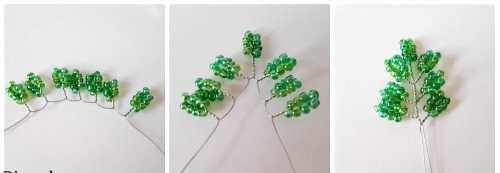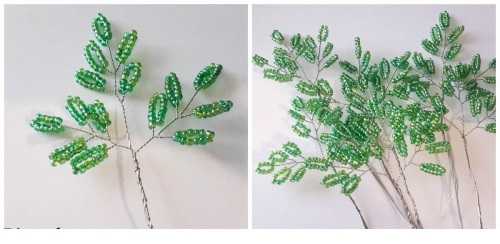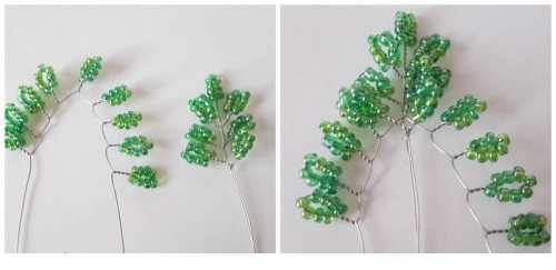 Теперь необходимо доплести еще несколько веток зелени для того, чтобы растение было еще пышнее. Техника также и остается петельной. Снова приготовьте низку бисера и плетите завитки по двенадцать бусин в каждой, как показано на фото. Оставляйте между каждым завитком приблизительно по одному сантиметру. Всего для поделки понадобится таких заготовок в количестве двадцати четырех штук, а уже из них вы сплетете полноценных восемь веток.