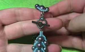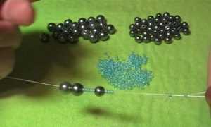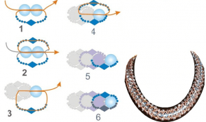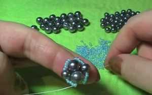 Данный мастер-класс будет максимально изложен благодаря подробному описанию схемы, пошаговым фото. Первым делом отрежьте удлиненный отрезок нити или лески. Наберите две крупные бусинки. Потом пять бисерин и одну маленькую стекляшку. Завершите низку пятью бисеринами. Придерживайтесь расстояния от боковин приблизительно пять сантиметров. Когда этот механизм плетения закончен, возьмите два кончика основного материала и сделайте несколько узлов. Обрежьте лишнее.