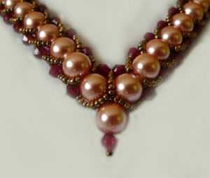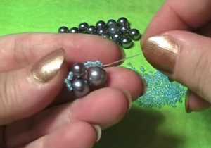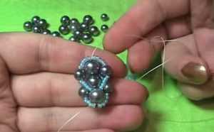 Проденьте иглу сквозь крупные бусинки и повторите последний описанный этап работы. Проденьте иголку сквозь эти же стекляшки еще раз, как это было сделано ранее. После этого наберите 1 крупную бусинку и повторите полоску из бисерин и мелких бусин. Своими руками аккуратненько раздвиньте образовавшиеся дуги и проденьте иголку снизу во вторую крупную стекляшку. И тут же протяните через вторую, которая начинает следующую полосу.