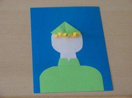 - вырезать зелёный квадрат и сложить из него пилотку: перегнуть квадрат крест-накрест по диагонали, сложить треугольником, загнуть нижние углы в разные стороны от центрального сгиба;