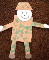 А вот ещё несколько идей аппликации солдата. Защитника Отечества можно изображать как схематично из геометрических фигур (работа для младшей группы), так и более подробно, с автоматов в руке. Сложность выполнения зависит от начальных умений и навыков ребёнка.