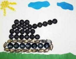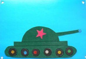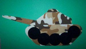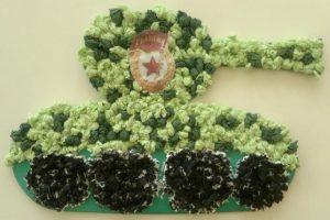 Сделать танк довольно просто. Для этого необходимо вырезать из зелёной бумаги формальные части танка: овал, трапецию, прямоугольник, круги. Из простых геометрических фигур получится самый настоящий танк. Украсить готовую работу можно цветами и государственным флагом.