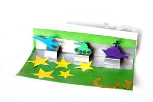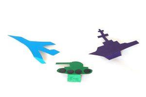 - вырезать из картона самолёт, корабль, танк с небольшими «хвостиками» внизу;