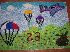 Не стоит забывать, что существуют и другие виды войск, не только сухопутные. Поэтому по такому же принципу, как и танк, для папы-лётчика или десантника легко собрать самолёт с парашютистами, а для служащего ВМФ – кораблик, подводную лодку или целый авианосец. Чтобы все части аппликации выглядели аккуратно и красиво, рекомендуется воспользоваться готовыми трафаретами.