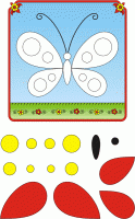 - Симметричные. Карапузам нравятся симметричные картины, так как они позволяют легко и быстро получить 2 одинаковых изображения. При этом нужно просто сложить пополам цветную бумагу и вырезать только половину заготовки. Шаблоны для аппликации симметричного типа можно нарисовать самостоятельно или распечатать на принтере.