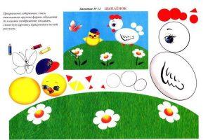 Обрывные. Изображение составляется из небольших бумажных кусочков. Этот вид идеален для образования фактурных образов: цыплят, барашков, цветов.