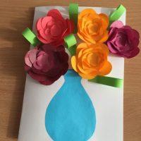 Такие необычные объёмные открыточки подойдут к любому празднику. Комбинация цветов и бабочек всегда вызывает трепет, а если это сделал ребёнок – в двойне!