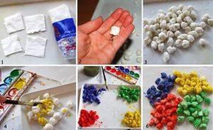 - Инструкция проста: салфетки разных цветов рвете на лоскуты или режете на одинаковые квадраты, которые скатываете в меленькие шарики.