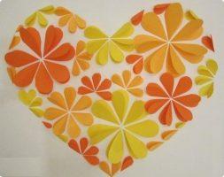 Теперь поговорим об изделиях не для начинающих. Детская работа, все-таки, не такая уж ровная и аккуратная, как работа взрослого. И один из вариантов – аппликация из сердечек. Пошаговые инструкции по изготовлению подобных изделий вы найдете в статье с поэтапным мастер-классом по этой теме.