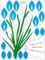 - Листья можно вырезать по тому же шаблону, что и лепестки, стебель – произвольно.