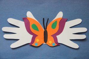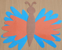 Конечно, просто ладошки, вырезанные по схеме, это не так интересно. Но почему бы не сделать из них бабочку, как показано на фото, или другую картинку? Здесь можно довериться детской фантазии, потому что ладошки подойдут к разным композициям.